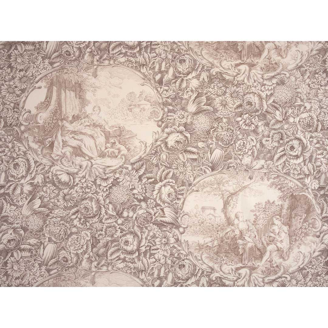 銅版画タッチの優雅なモノトーンの大柄プリント布。繊細に描かれた花のフレームに、中世風の情景をはめ込みました。バッグや裏布に使っても。