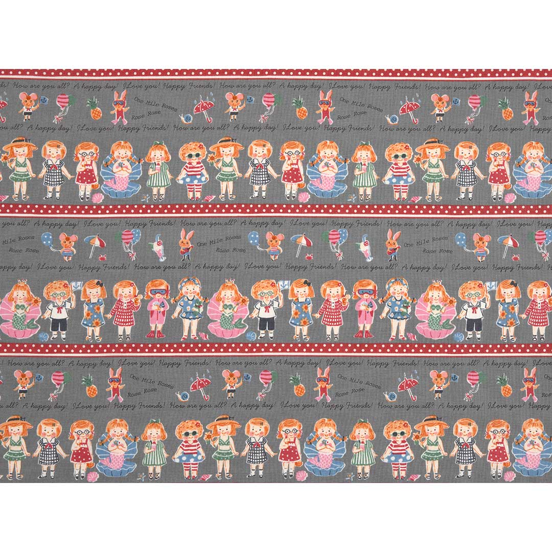 休日の女の子の楽しいお出掛けファッションをボーダー状に並べた、愛らしいプリント布です。ボーダー幅は約10cm。切り取ってマスコットにしたり、タペストリーのボーダーにしても個性的な仕上がりに。