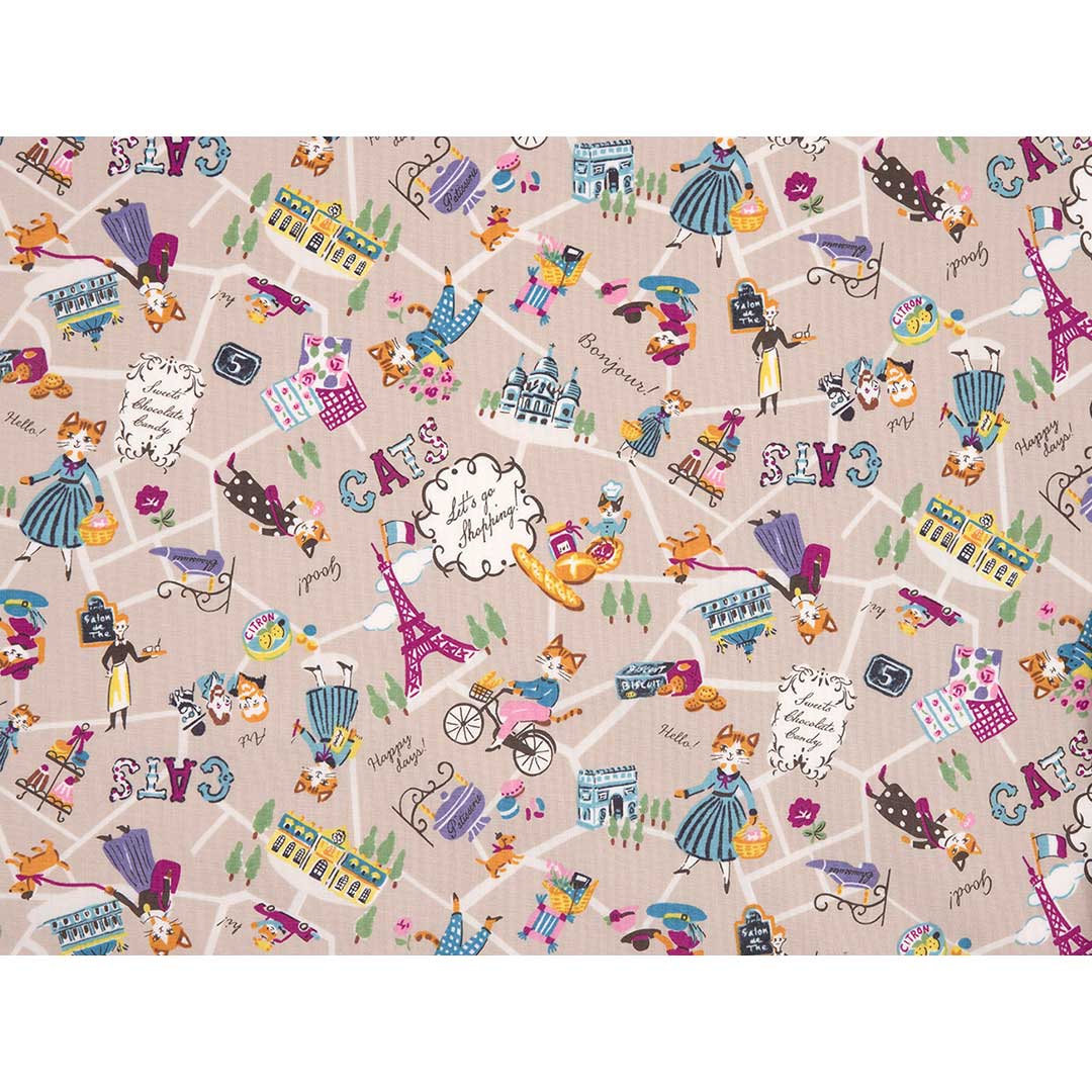 おしゃれなネコがパリの街でお買い物。名所やスイーツなど、“パリのお勧めエトセトラ”を紹介するおしゃれなプリント布です。布箱などにしてもキュート。