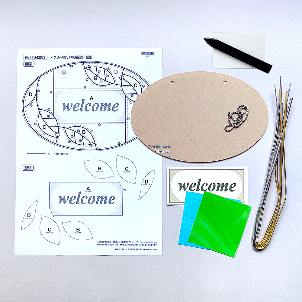 土台(アクリルまたはガラス)、ボーニングペグ・板紙スキージー 各1、フィルム一式、リード線一式、作り方説明書・図案付き(作品写真)1枚