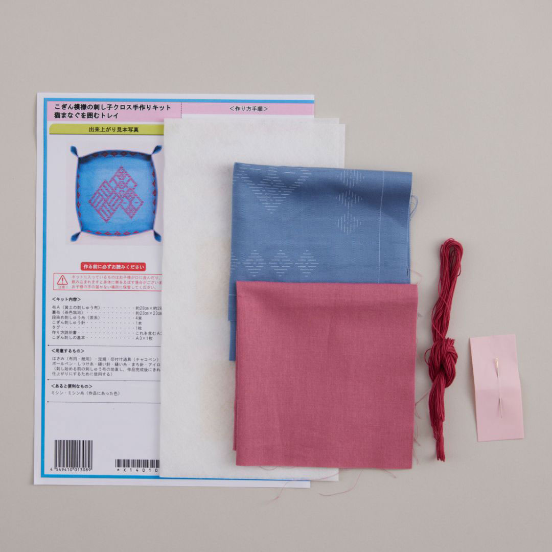「こぎん刺し」は本来であれば、織り目を数えて刺し進める技法ですが、本キットは下絵が印刷された布に「刺し子」の技法を使って表現する手芸キットです。手軽に伝統文様の布小物づくりがお楽しみいただけます。