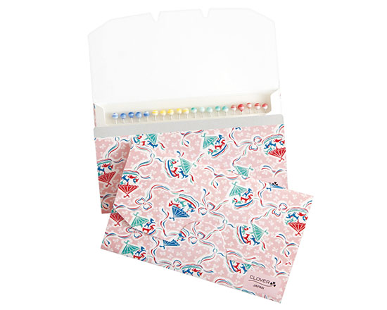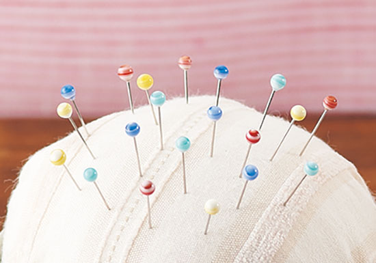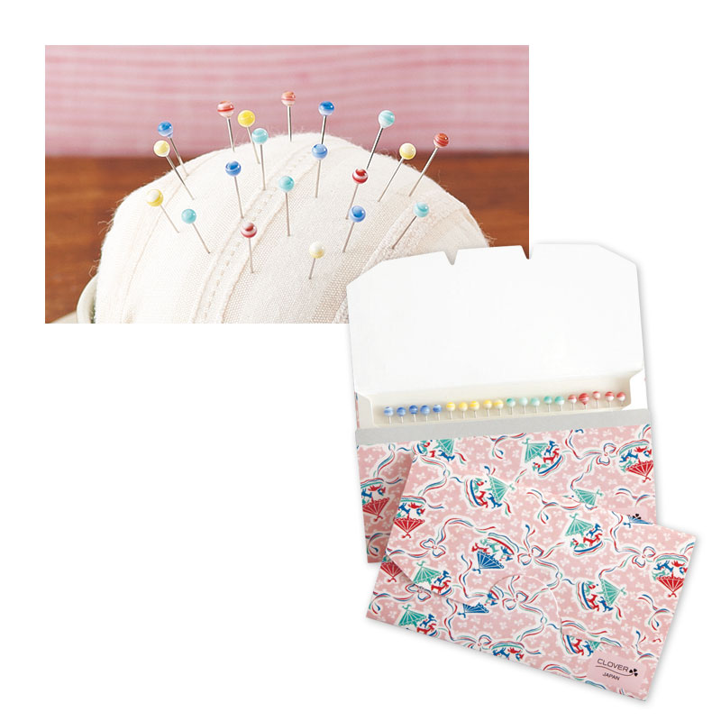マーブル模様の可愛いまち針。耐熱ガラス製なので、外さずにアイロンがかけられます。