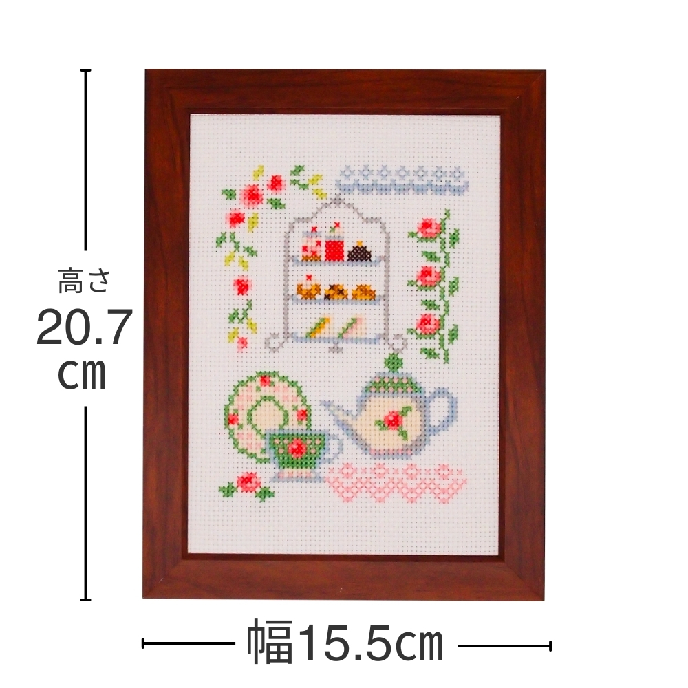 糸を交差させながら刺し進めるクロスステッチで作成します。刺しゅうが終わったら厚紙にテープで張り、付属の額に入れて飾りましょう。制作時間の目安は9時間程度です。