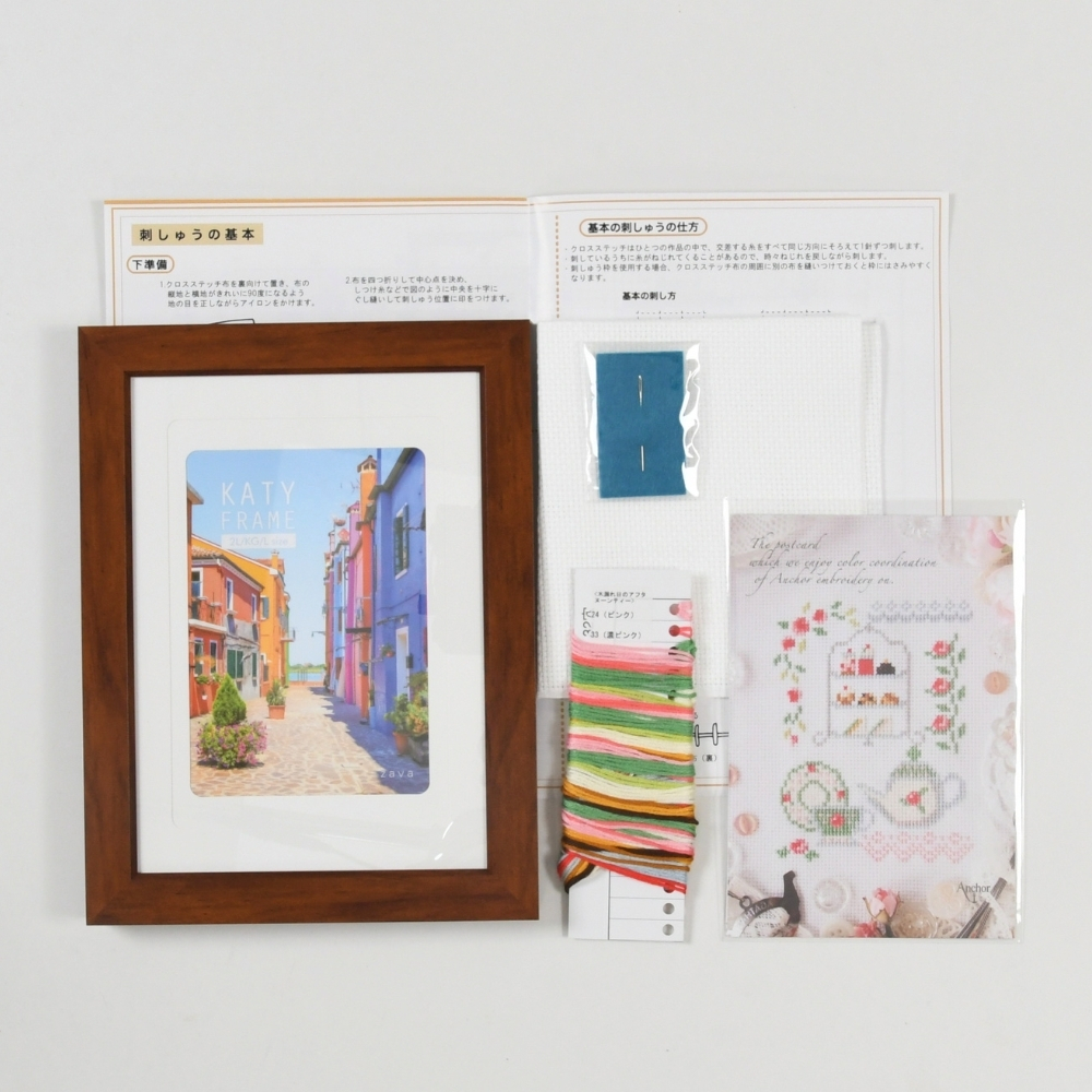 クロスステッチ布( グラツィアーノアイーダ14 カウント)、25 番刺しゅう糸、樹脂フレーム、クロスステッチ針(26 番)、作り方説明書、ポストカード、厚紙