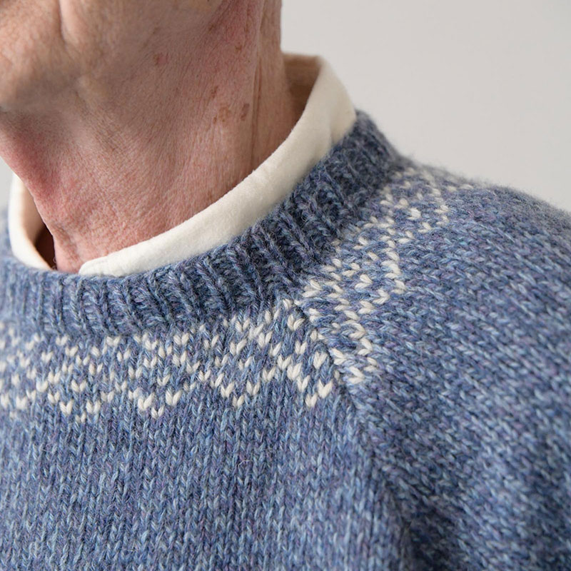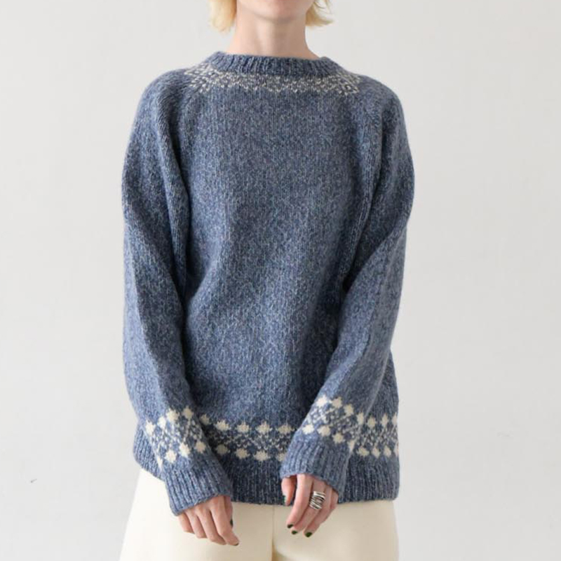 綺麗なブルーが冬空に映えて、小さな編み込み模様が程良い可愛さを添えてくれるプルオーバー。衿ぐりの編み込み模様は、ラグラン線で崩れても気にならないデザインにしました。お揃いの帽子もかぶりやすくおすすめです。