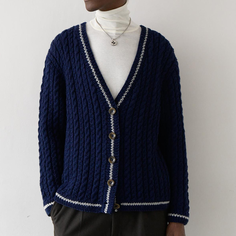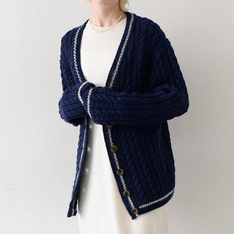 細いケーブルを並べたベーシックデザインのセットインスリーブカーディガンは、1枚あって間違いなし。ネイビーにライトグレーのラインが効いています。このラインが軽さとカジュアルさをプラスしてくれます。