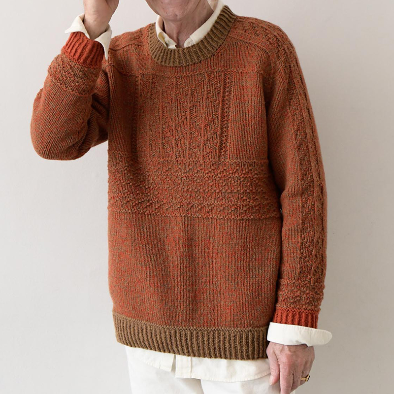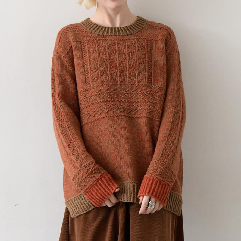 表目裏目のガーンジーニットをファッショナブルにアップデート。レンガ色と薄茶を引き揃えた2本どりのミックス具合が絶妙です。裾と衿ぐりは薄茶のみ、袖口はレンガ色のみでテンションを変えています。