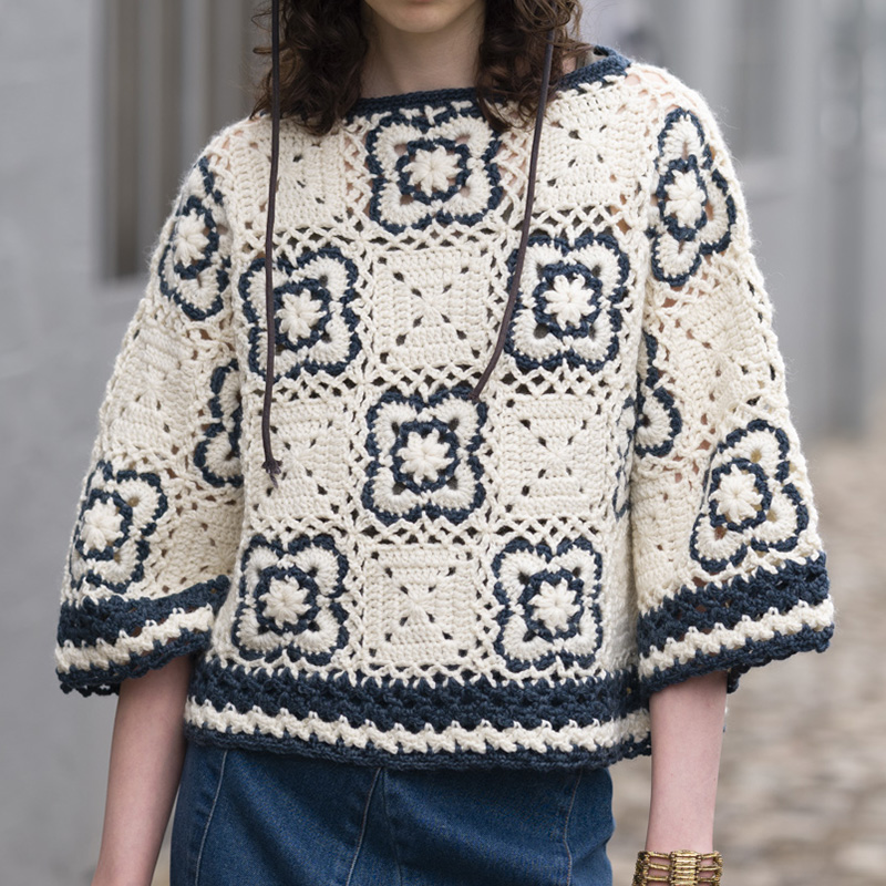 太めの毛糸で編むモチーフつなぎはザクザク編めるのがうれしい。モチーフ1枚の段数もモチーフの数そのものも少なくて済み、つなぎながら編み進められるので仕上げも楽々。できあがりも可愛いくて、言うことなしです。