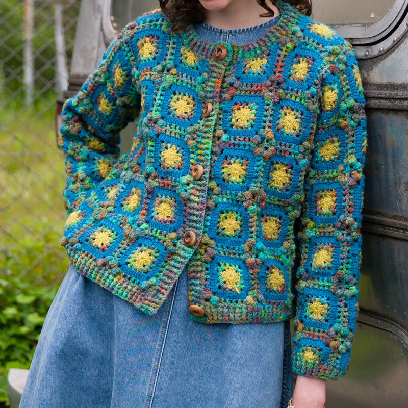 材料:ダイヤモンド毛糸 ダイヤエマ 緑・青・茶色系段染め(4504)380g/13 玉。ダイヤエポカ 青(338)250g/7 玉、黄緑(364)85g/3 玉。直径25mm のボタン5 個、直径18mm のボタン7 個。