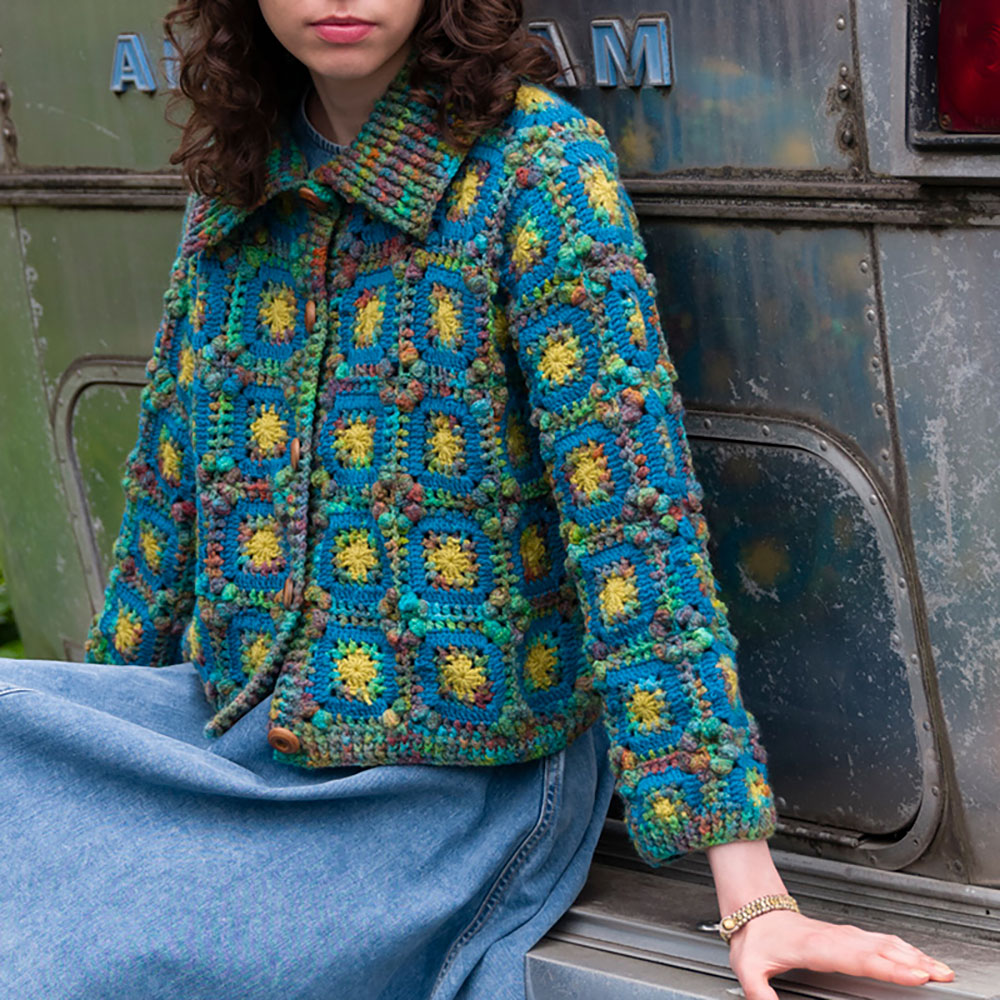 各モチーフの角が集まると、新しい模様が現れます。配色に段染め糸と単色を組み合わせるのも、予測不可能な色合わせの妙が楽しめてオススメです。とりはずせる大きなつけ衿も便利に使えます。