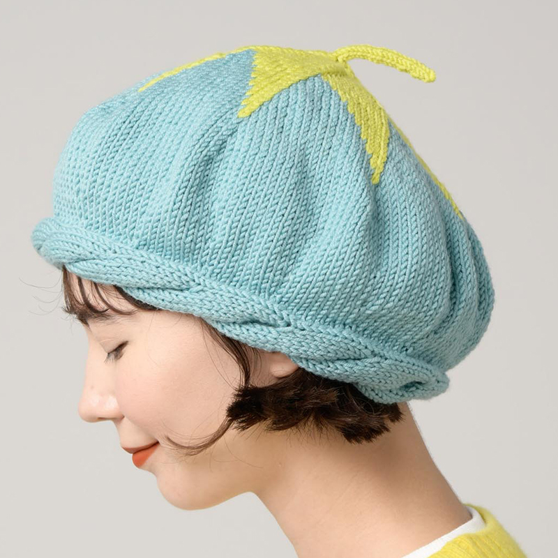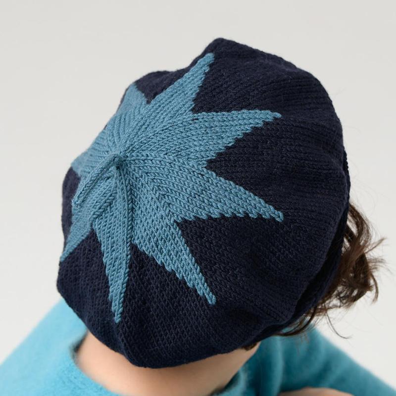 星の編み込み模様とぐるりと縁どるケーブル模様が編んでいて楽しいベレー帽。組み合わせる色によって印象がかなり変わるので、何色か色を変えて編んでみるのもオススメです。チョロンと長めに飛び出たチョボがかわいいポイントに。