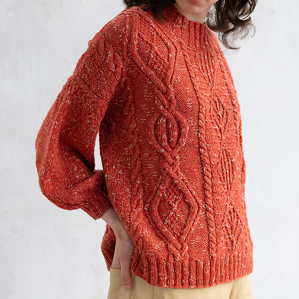 スラブやネップ、起毛など異なる形状の糸を撚り合わせたやわらかな風合いの糸は、がっつりケーブルのアラン模様で編んでも軽い仕上がりが嬉しい。拾い出しの袖に交差模様を入れた技あり!でチャーミングなパフスリーブのデザインです。