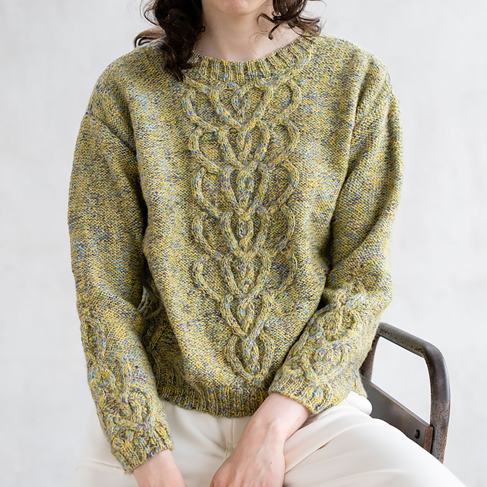 裏目ベースに浮かび上がるケルティック風のケーブルが、シンプルで上品なデザイン。ハートのようにも見える模様を凝ったバランスで配置してあり、編み方もマニアックで編み心を刺激されます。極軽に仕上がるスラブ調の糸で。