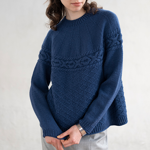 ○×のケーブル、ブラーニー・キッスがヨークをぐるりと飾るプルオーバー。ヨークと身頃は、ケーブル模様からそれぞれ拾って編んでいます。編みながらときどき体に合わせて、好みの丈感で仕上がりを調整することができます。