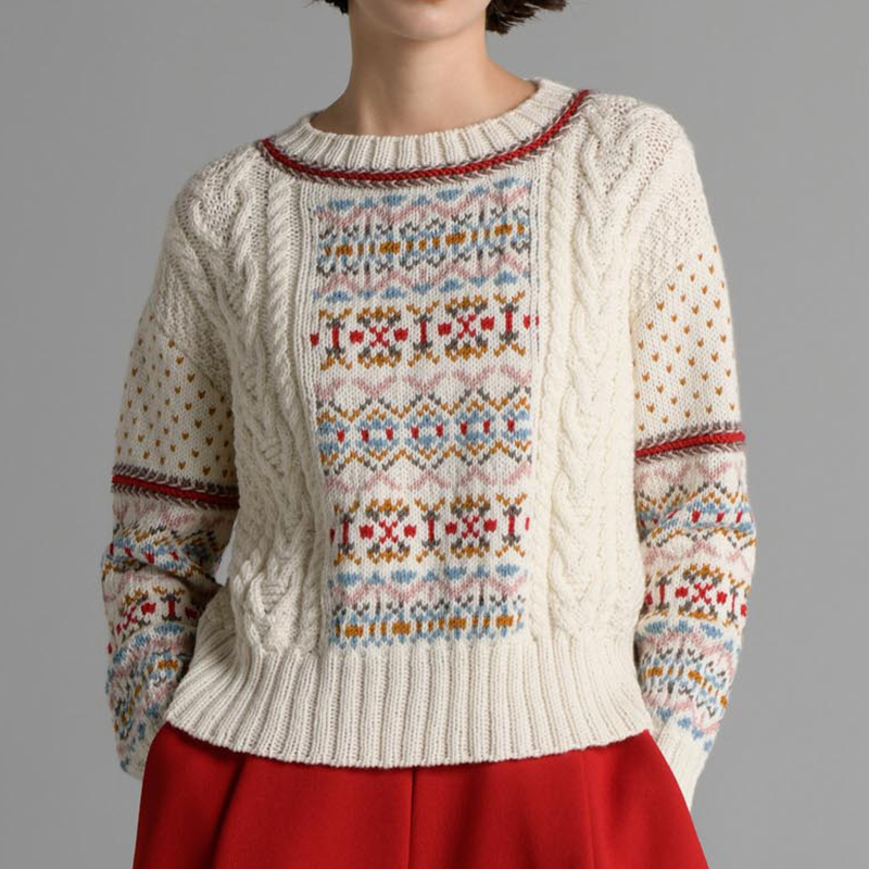 伝統のフェアアイル柄を可愛らしい配色で。総編み込みではなくケーブル模様も組み合わせてメリハリをつけています。ブレードのような切り替えのラインが効いています。
