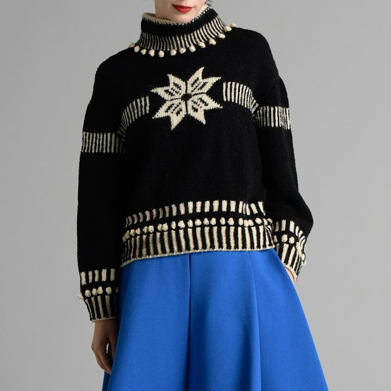 大きな雪柄をセンターに配して、ラインの編み込みをポイントにモダンにまとめました。ゴム編みとの境目にたっぷり並べたボッブルがキュートなアクセント。