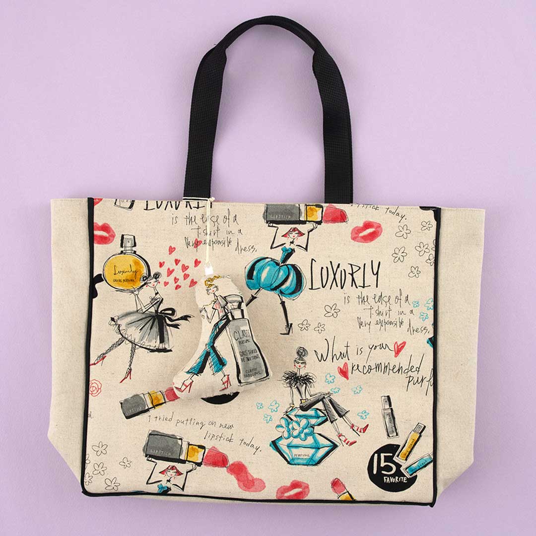 [綿麻キャンバス]綿殻入りのやや厚手のキャンバス地。ルージュや香水など、コスメアイテムとおしゃれな女性を描いた、インパクトのある大柄プリントです。バッグやインテリアなどに。