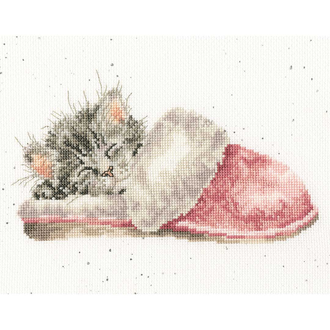 【キット作り方つき】ピンクのスリッパに入って眠る、愛らしい子猫のクロスステッチ作品です。しぶきのような模様がプリントされたアイーダに刺します。中級の方向き。Bothy Threads社製(ボシー・スレッズ)。
