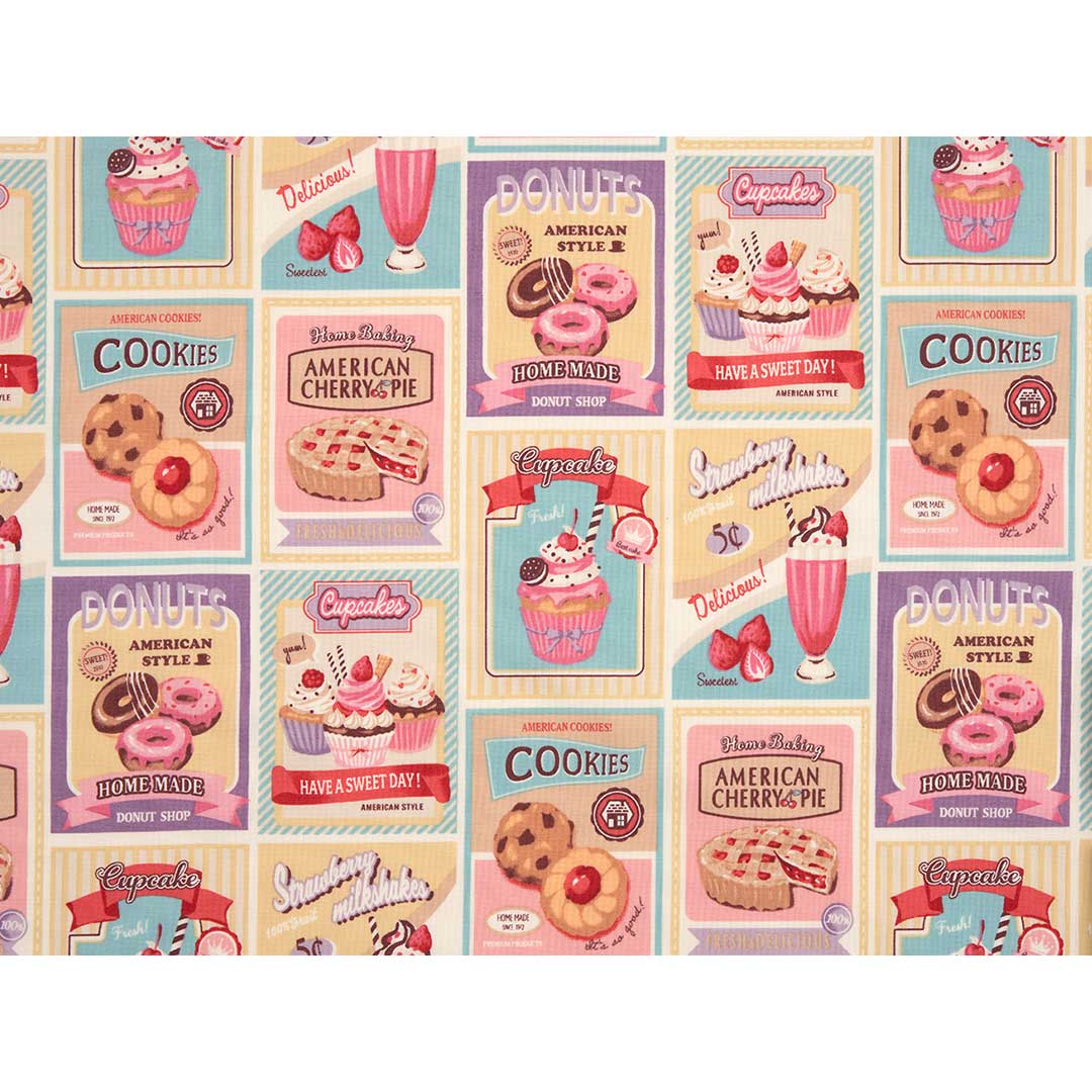 パステル調のレトロなスイーツラベルを描いた可愛らしいプリント。切り取って使っても。モチーフの大きさは約9.5×7cm。