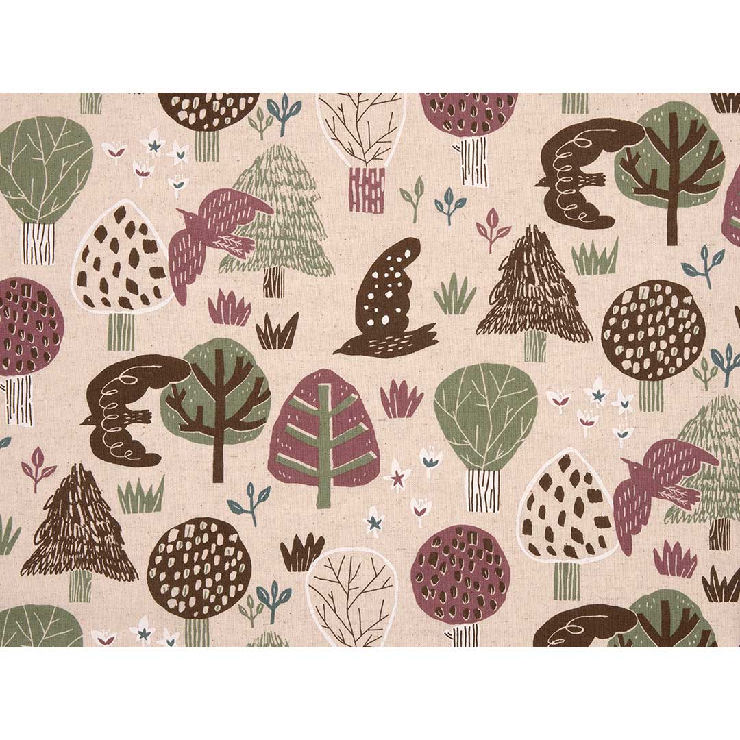 [綿麻キャンバス] 綿殻入りのナチュラルな綿麻地に、北欧テイストの木や鳥を描いたおしゃれなデザイン。やや厚手なのでバッグやインテリアなどに。