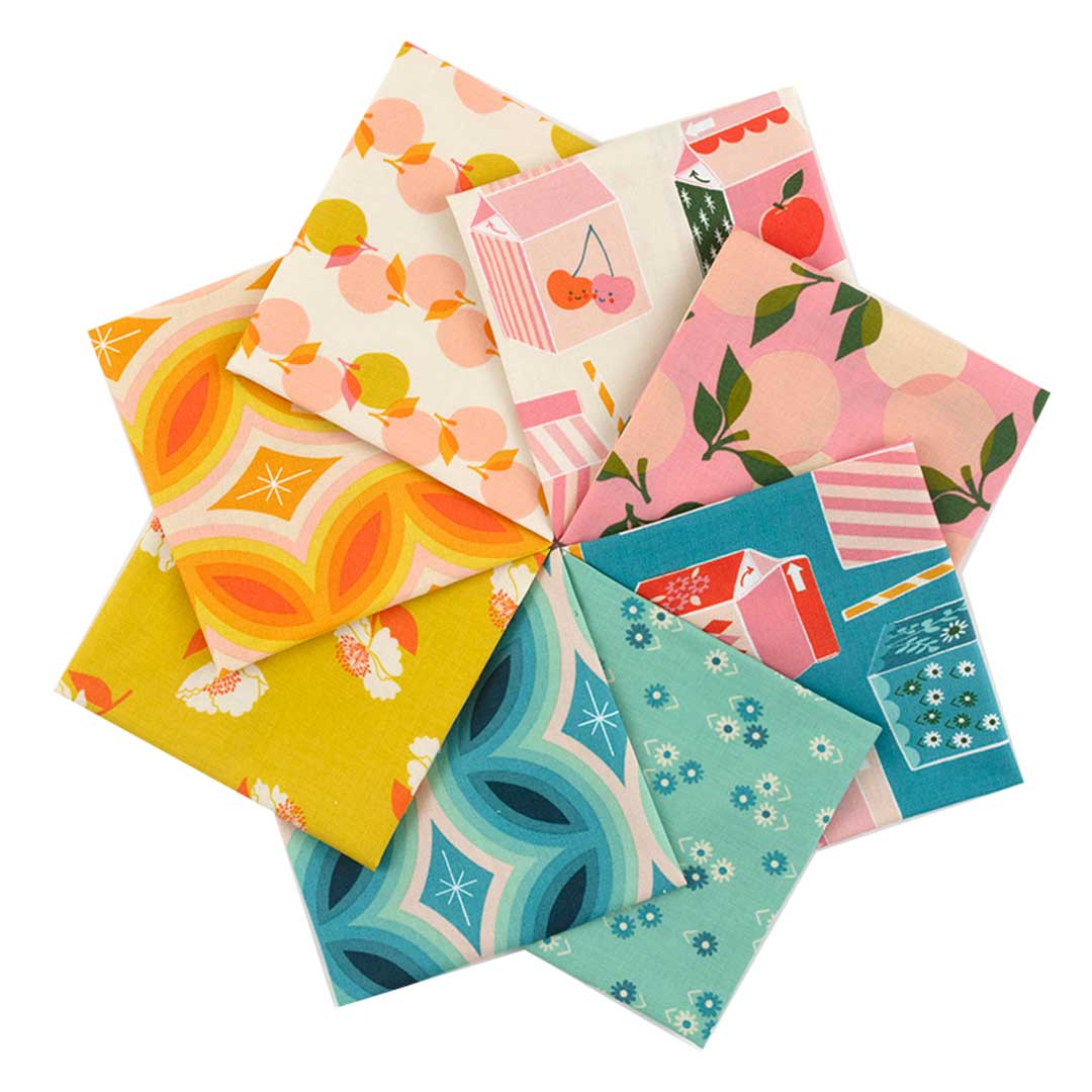 [USA] 果物やパックジュース、幾何柄などをレトロな色合いで描いた、どこか懐かしい雰囲気のカットクロスセットです。