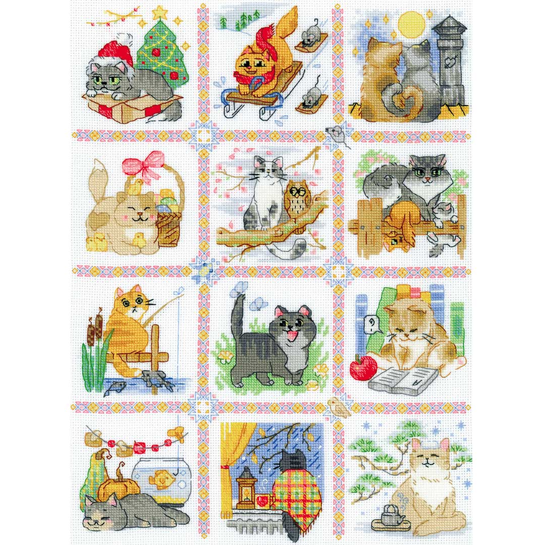【キット作り方つき】イラストタッチのコミカルな猫をモチーフにした、12ヵ月を描いたクロスステッチ作品です。上級の方向け。リトアニア・RIOLIS社製。