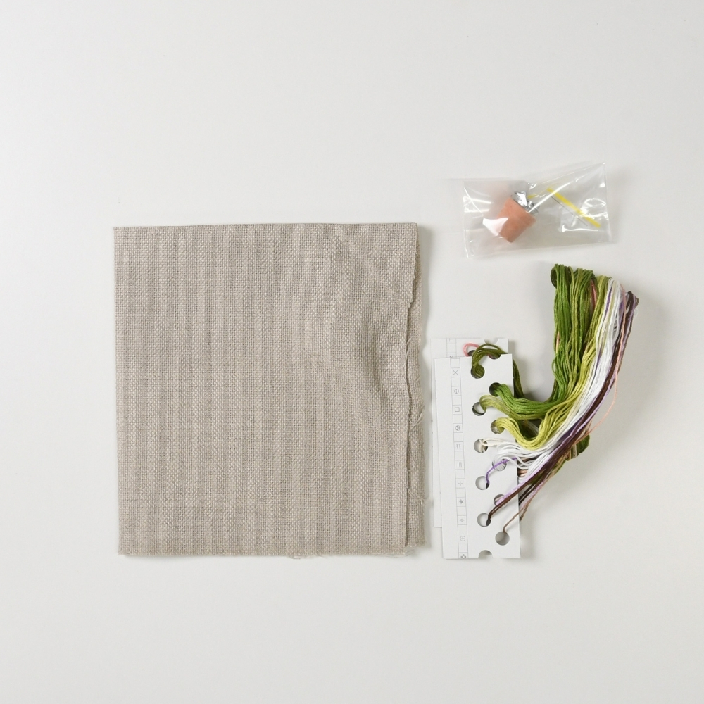 ブロック織りでカウントがしやすい麻本来の色のアイーダ生地に刺していきます。しっかりと張りのある生地で刺しゅうがしやすいです。仕上げにかわいいミニチュアアクセサリーをつけましょう。