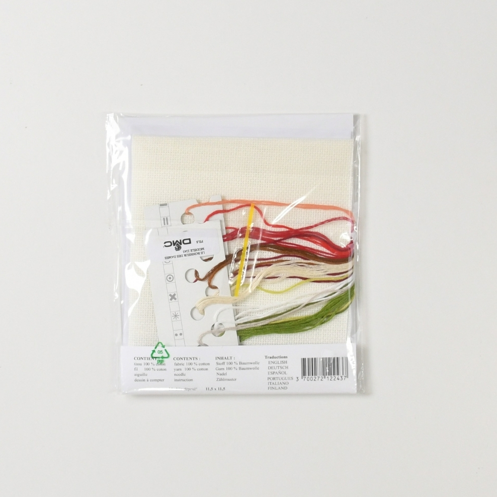 コットンアイーダ生地(7目/1cm)、25番刺しゅう糸(DMC)、クロスステッチ針、図案と説明書、簡単な日本語訳