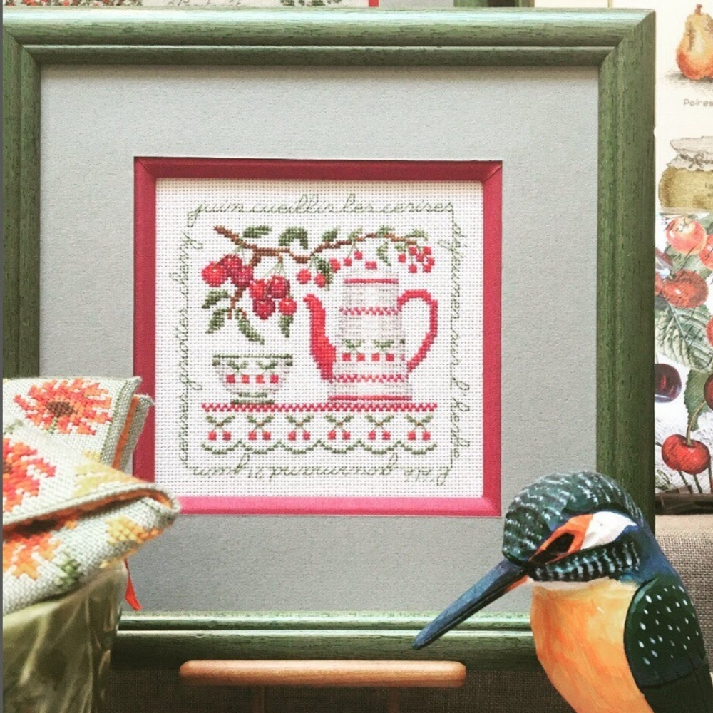 約11.5cm角の四角く小さいサイズのクロスステッチキットです。 さくらんぼに、さくらんぼ柄のポッドやボウル、レース。