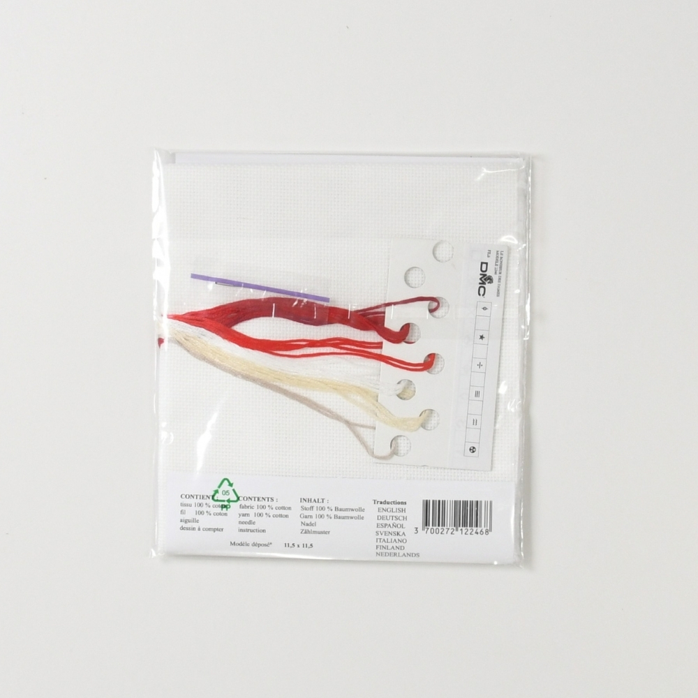 コットンアイーダ生地(7目/1cm)、25番刺しゅう糸(DMC)、クロスステッチ針、図案と説明書、簡単な日本語訳