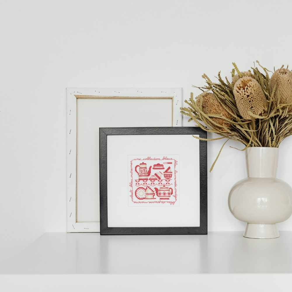 ブロック織りでカウントがしやすい白色のしなやかなアイーダ生地に刺していきます。図案の周りには文字をバックステッチで施し、一味違うボヌール社らしい作品が出来上がります。