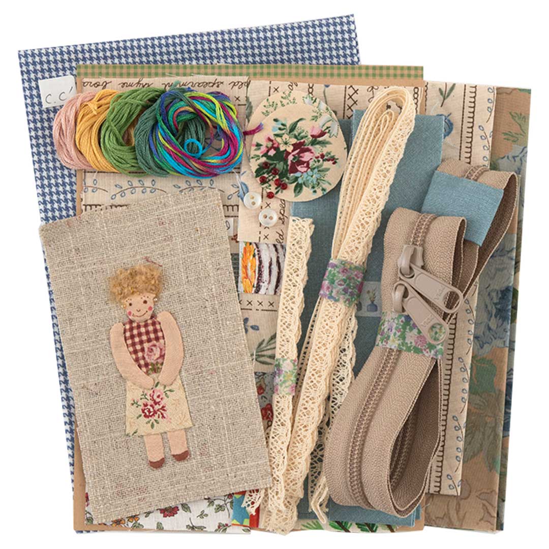 表布、裏布、完成済みドールアップリケ、バイアステープ、刺しゅう糸、レース、ビーズ、ファスナー、ボタン