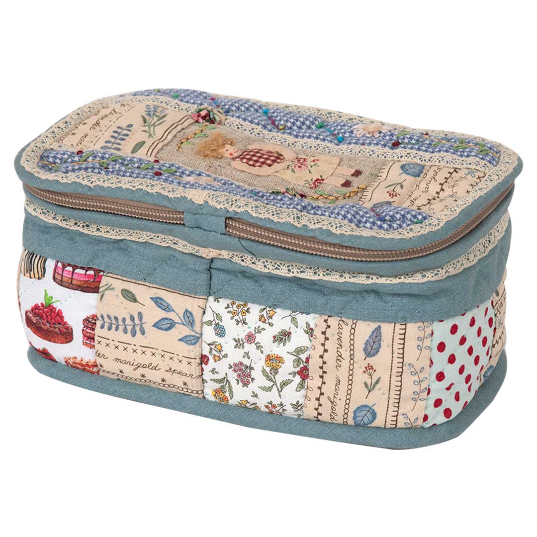 【キット作り方つき】化粧品や裁縫用具入れなどに活躍するバニティータイプの小物入れ。様々な布をピース ワークしたベースに、完成済みのドールのアップリケ布やレースなどを合わせます。