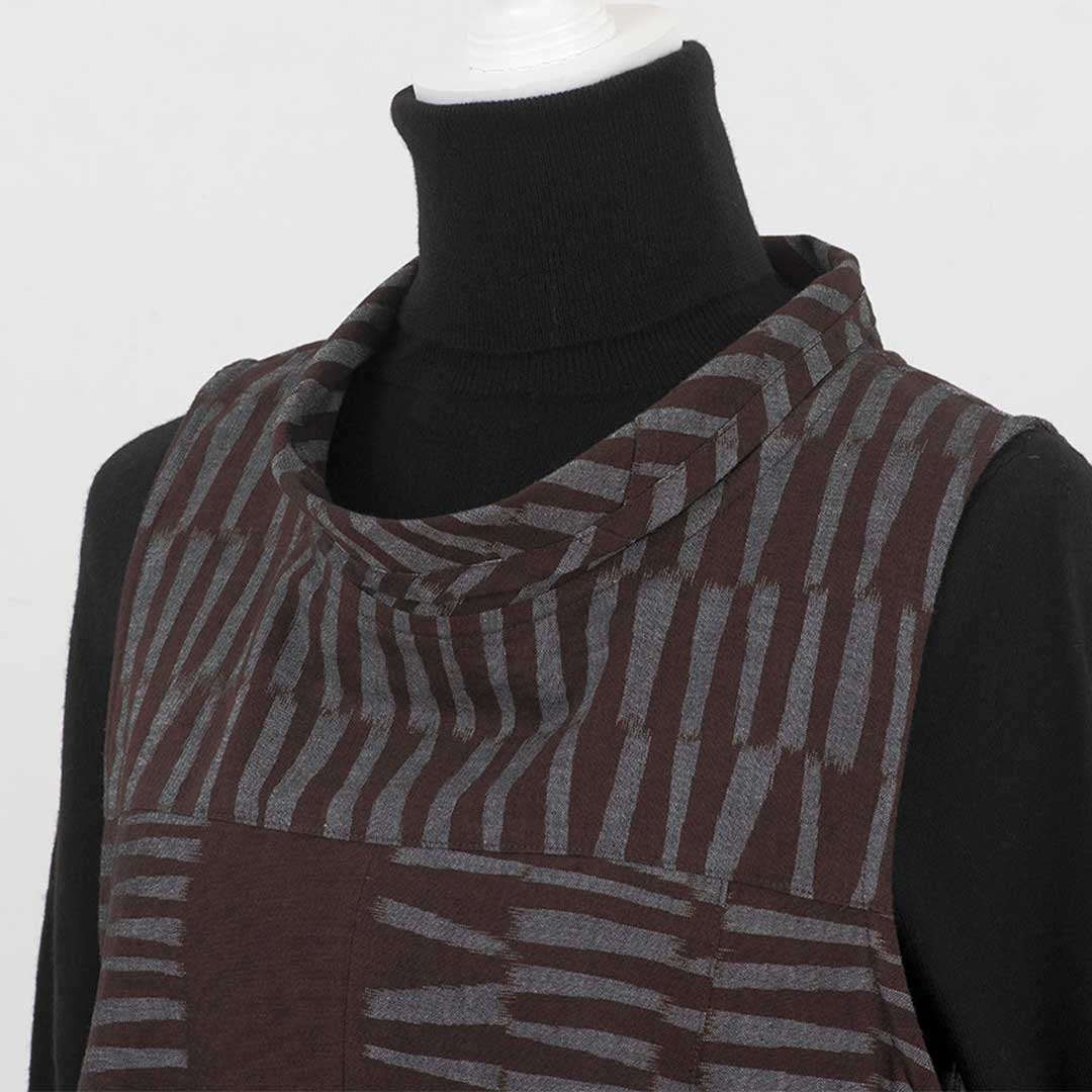 【限定10】【完成品】くくり染した経糸と緯糸を合わせた複雑な柄の美しさが特徴の久留米絣。伝統を守りつつ、モダンな印象を持つ坂田織物の久留米絣をご紹介。秋らしい色目のワンピース。3種類の布を組み合わせたおしゃれなデザイン。スタンドカラーや切り替え部分にタックをとるなどしたデザイン。左右にポケットもあり便利です。
