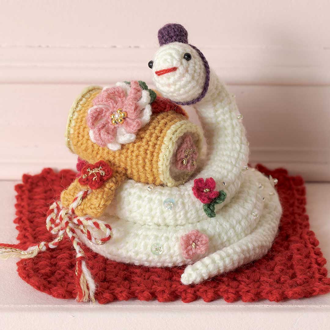 【キット作り方つき】細編みメインの基本的な技法で干支の巳を編み上げます。お花モチーフやビーズをちりばめて華やかに。紫色の帽子と細身のお顔の表情が上品です。打ち出の小槌を抱えた縁起のいいお飾りです。もうせん替わりの赤い敷物も編んで一緒に飾れます。初級者。