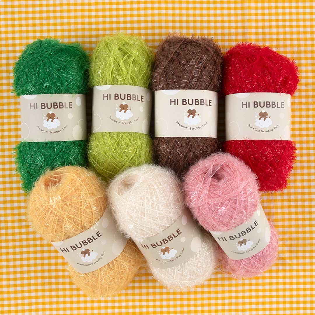 【キット作り方つき】韓国で大人気のエコたわしが編める、アクリルの並太毛糸を7色セットで。少量の洗剤で豊かに泡立ち、水切れもいいたわしが約30個作れます。お好みで配色を変えても。