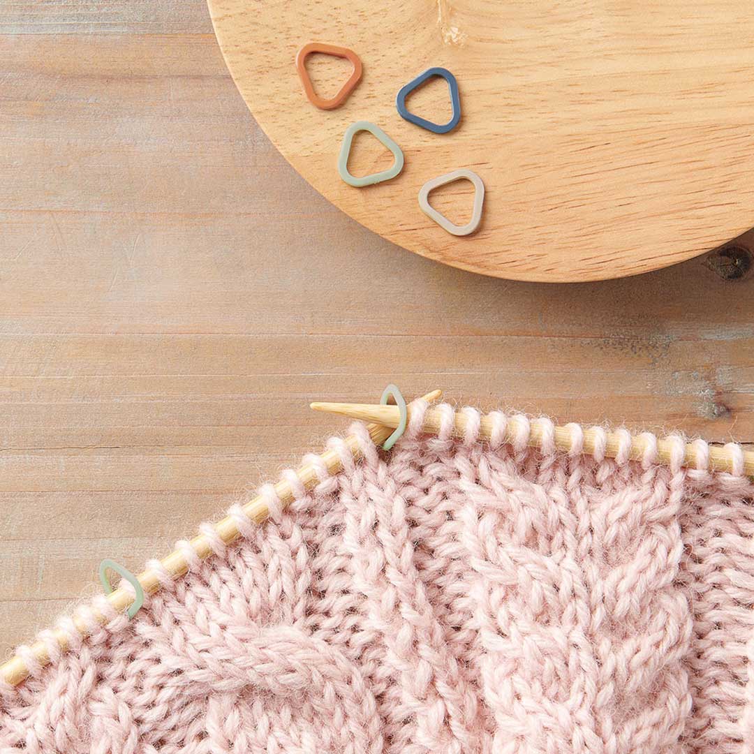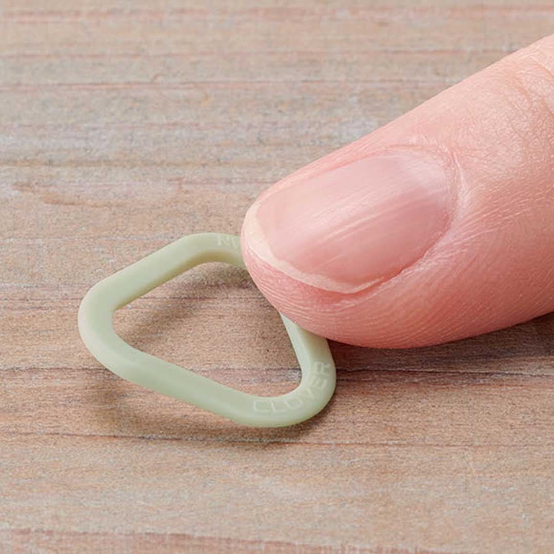 人気の三角リングがウエーブ形状に。編み地に通しても目を広げにくく、平らな場所でも拾いやすい仕様です。[XS]は0〜4号、[S]は5〜10号、[M]は11〜15 号に対応します