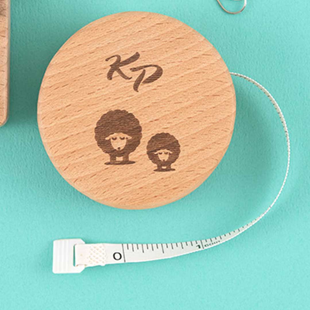 可愛い焼き印が入った滑らかな木製メジャー2種です。[スクエア]は横から、[ラウンド]は正面からのヒツジをデザイン。メジャーは表裏にメートルとインチの目盛りが入っています。