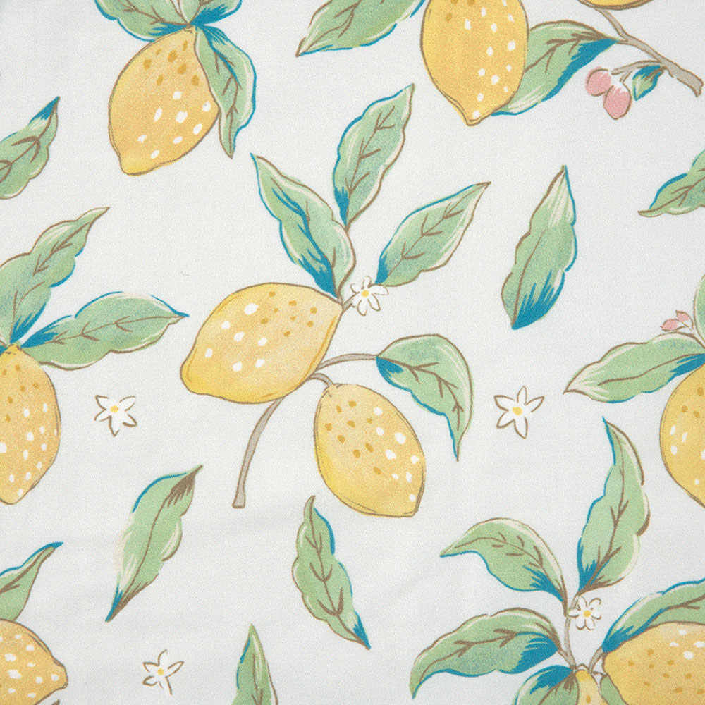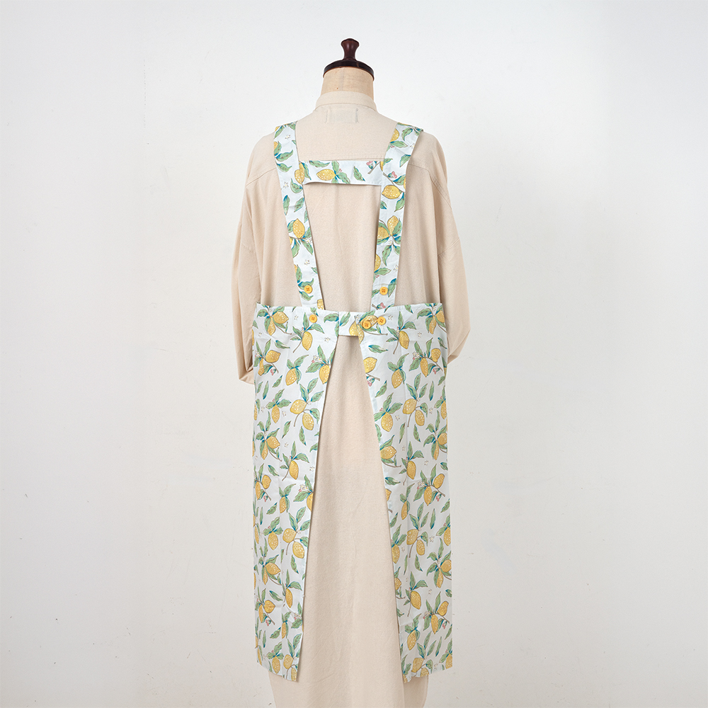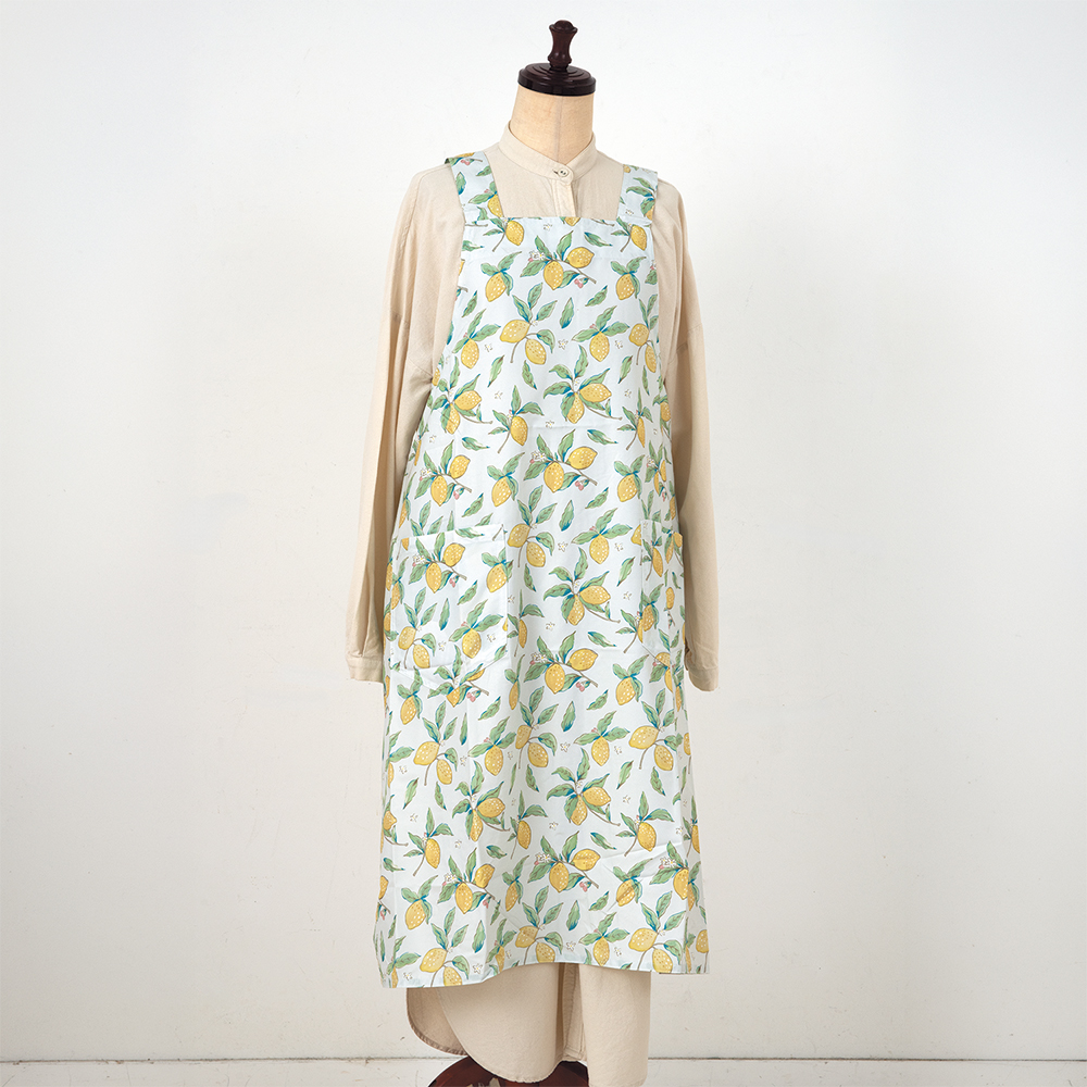 ●完成品●ポリエステル製の、軽くて乾きやすいエプロンです。デジタルプリントで細かな手描きタッチが再現された爽やかなレモン柄。静電気防止加工、抗菌加工、速乾で扱いやすい一枚です。税込定価2750円→1925円(30%引き)。