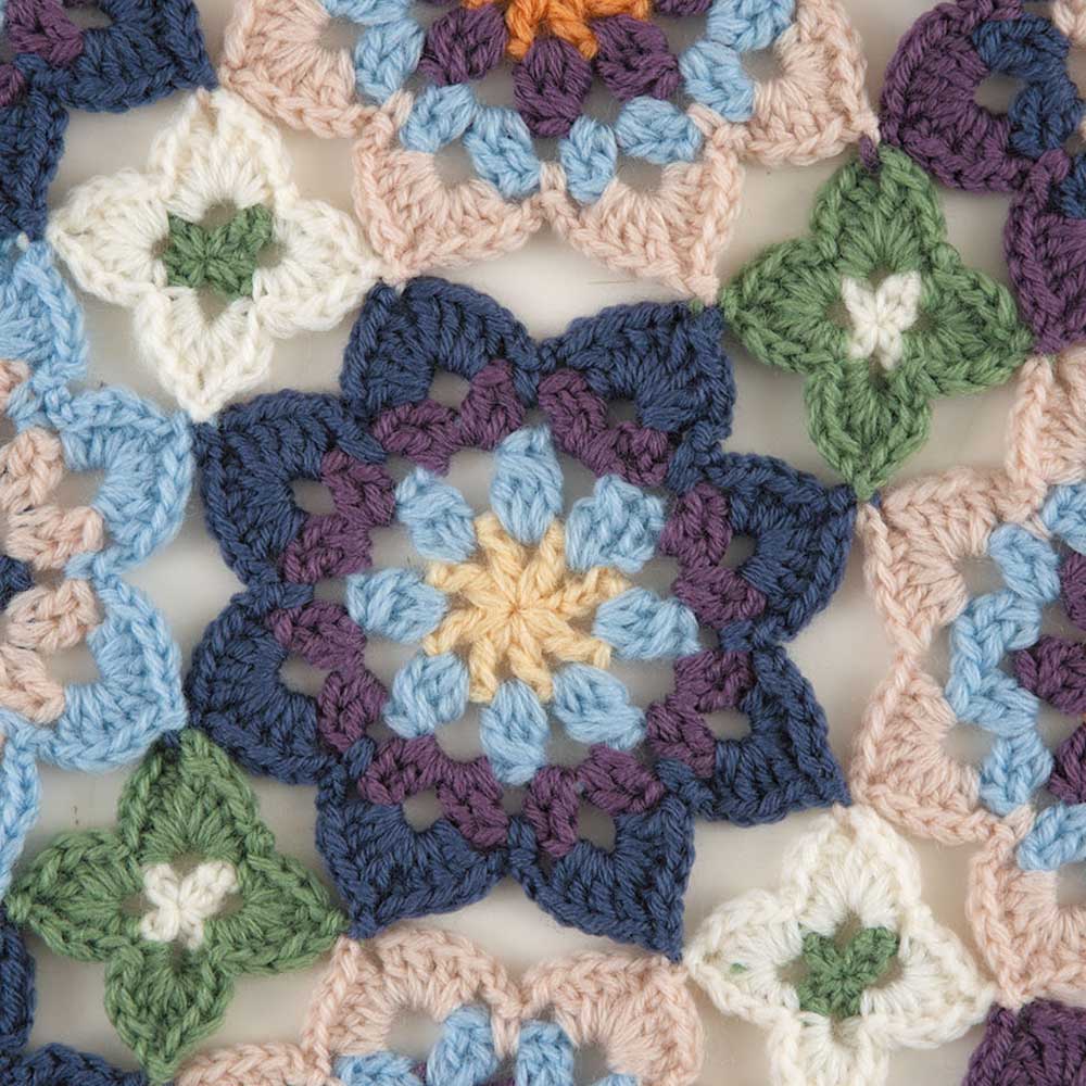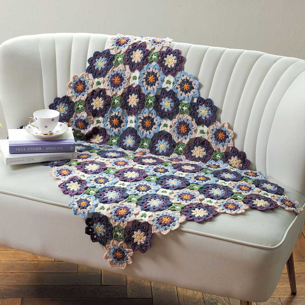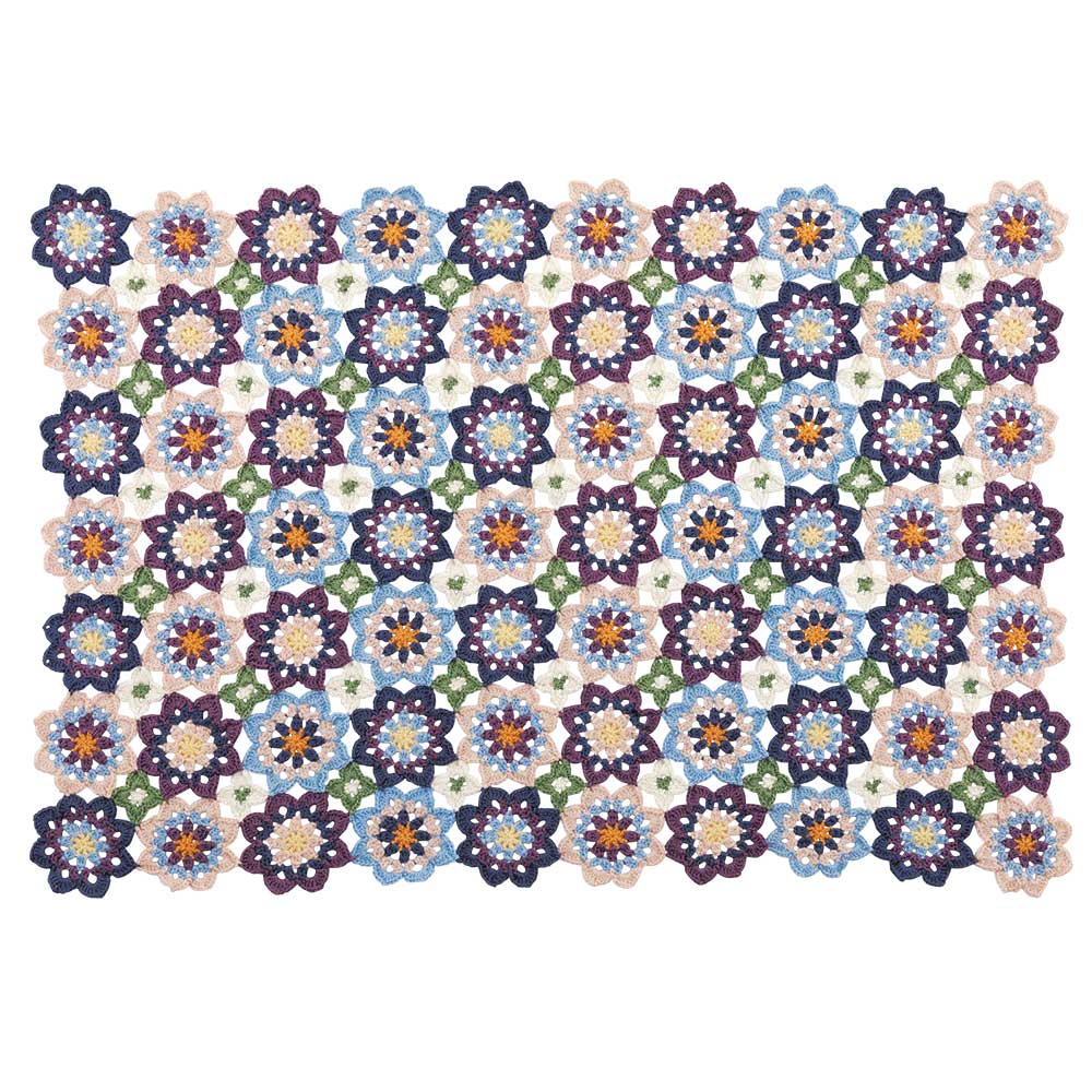 【キット作り方つき】8色の糸を使用する、ビオラの色をイメージした春めくブランケット。モチーフをつなぎながら編み進めます。初級の方にもお勧めです。