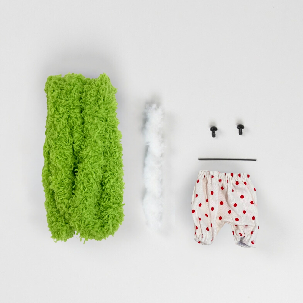 ふわふわの素材が巻いてあるワイヤーを指定の長さでねじってかたちを作っていきます。お腹にも白いモールを貼ってから仕上げにはさみでカットしていきます。最後に接着剤で目と口を貼ったら完成です。付属のドールパンツをはかせて、おめかししましょう。作り方動画もついているので初めてモールドールを作る方にもおすすめです。