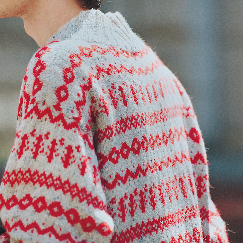 袖のゴム編みを長くしてみたら、なんだかフレッシュなノルディックセーターになりました。地色にはフェルテッドツイード、差し色にはアルパカクラシックを使い、鮮やかで少しモダンな印象に。彼が着ているのはダブルネックタイプ。下にタイトなタートルを合わせても素敵です。