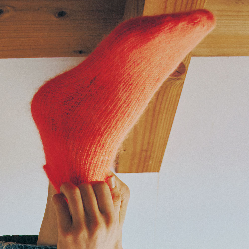 キッドシルクヘイズは、芯糸がシルクなので、見た目よりかなり強い糸。ふわふわと心地よい履き心地もカラフルな色展開も、絶対靴下向きだと思ってました。足裏はきっと少しずつフェルトのような肌触りになるはず。そんな経年変化も楽しめる、特別な靴下です。