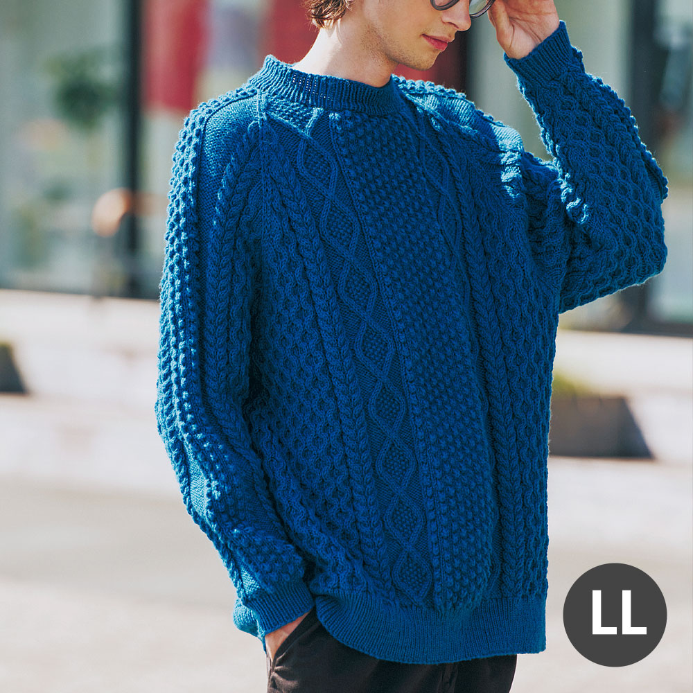ボッブルのつぶつぶをたくさん並べて編んだら、新鮮な印象の模様ができたので、伝統柄のアランと合わせてセーターにしました。衿ぐりから肩を通って袖口まで、つぶつぶラインを映画のキルビルっぽく(わかる?)。レディースからメンズまでサイズが選べるので、お好きなサイズ感でぜひ。