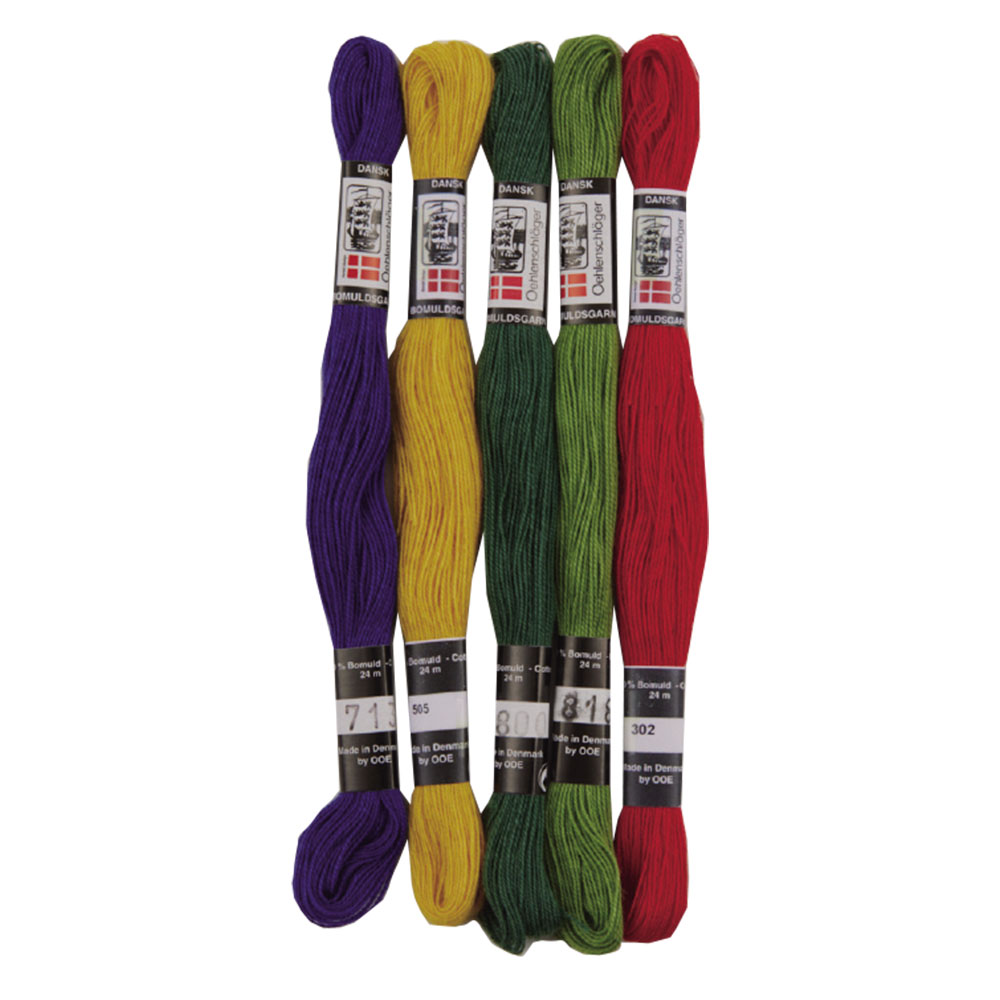 デンマークの老舗刺しゅうメーカー、O.Oehlenschlagers Eftr.Aps社(オーレンシュレーガー・通称OOE)の花糸。27ページ掲載の作品に使用した糸セットです。つやのない自然で素朴な色味と風合いが特徴です。糸をさばかず、1本でそのまま刺しゅうすることができます。
