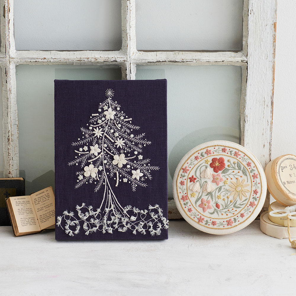 モミの木の茎はスプリットステッチ、葉はフライステッチ、エリカはコーラルステッチ、ツバキはワイヤーリーフで花びらを作り、布に差し込んで立体的に仕上げます。