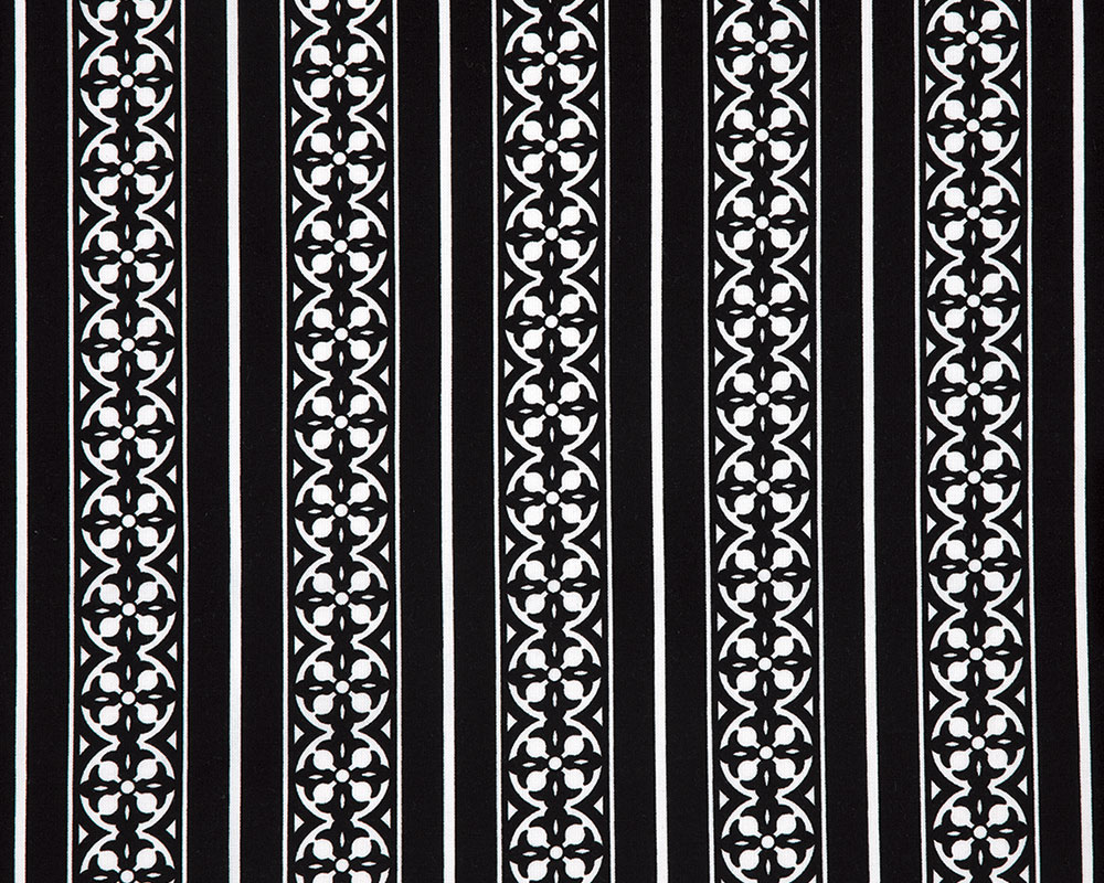 [USA] ハワイで人気のバッグブランド、ヴェラ・ブラッドリーのテキスタイル。白黒のモノトーンでシックなストライプ柄です。タペストリーの周りなどに。植物をモチーフにした幾何柄をストライプ状に並べたデザイン。幾何学模様のストライプは約3cm幅。