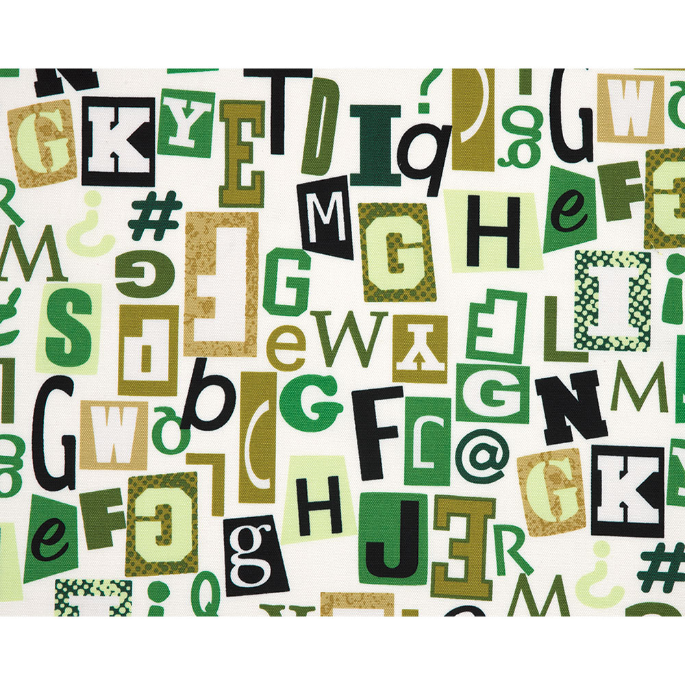 [オックス]いろいろな書体のアルファベットや記号を、グリーンのトーンで描いたおしゃれなプリント。やや厚手のオックス地なので、バッグやインテリアなどに。