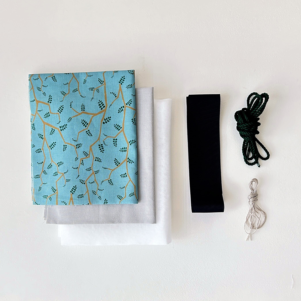 ジグザグに伸びた枝と小さな葉っぱがかわいい観葉植物(リトルベビー)をイメージした“little baby”のプリント柄のリボン巾着バッグのレッスンです。