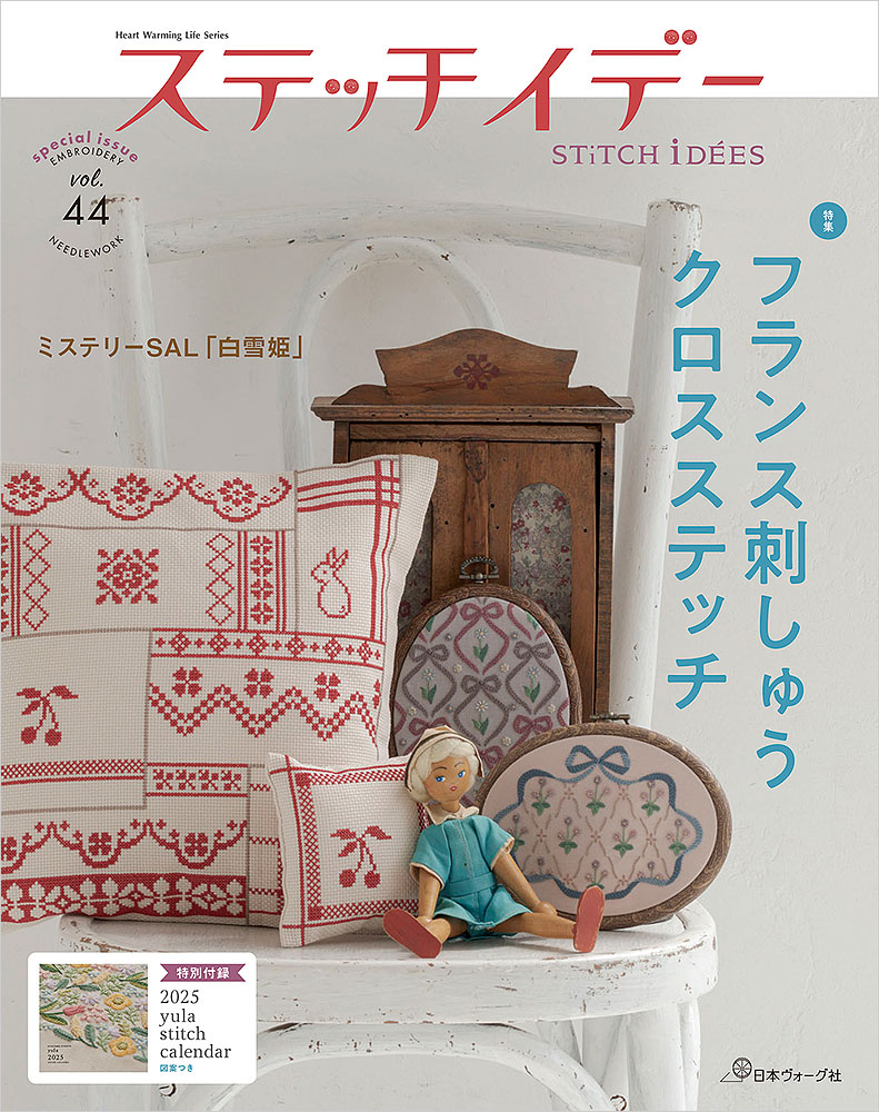 ステッチの技法別に特集した特別号。フランス刺しゅうとクロスステッチの2大特集です。作品提案、プロセスレッスン、アトリエ取材など幅広くご紹介します。人気連載「ミステリーSAL 白雪姫」は最終回。特別付録に人気作家yulaさんの図案のついた「刺しゅうカレンダー2025」が付きます。